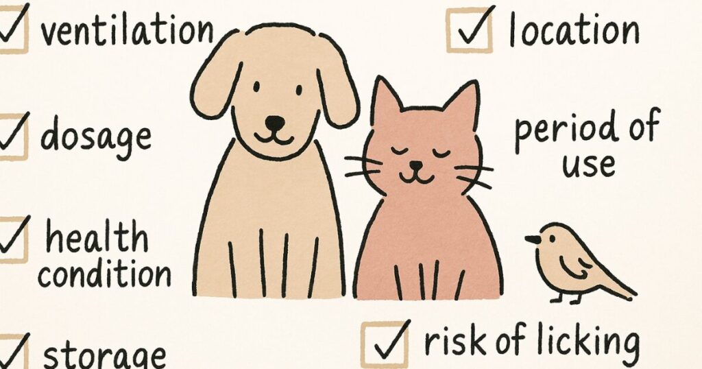 ペットとアロマディフューザーを併用する際のチェックポイントを示した図解