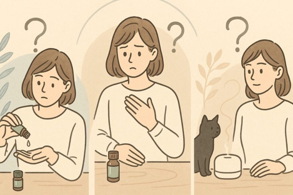 - 「何滴?」の正解は「タンク容量」で決める部屋の広さではなく、ディフューザーの水の容量(例:100mlで2〜3滴)が基準です。入れすぎは故障や不調の原因になるので注意しましょう。