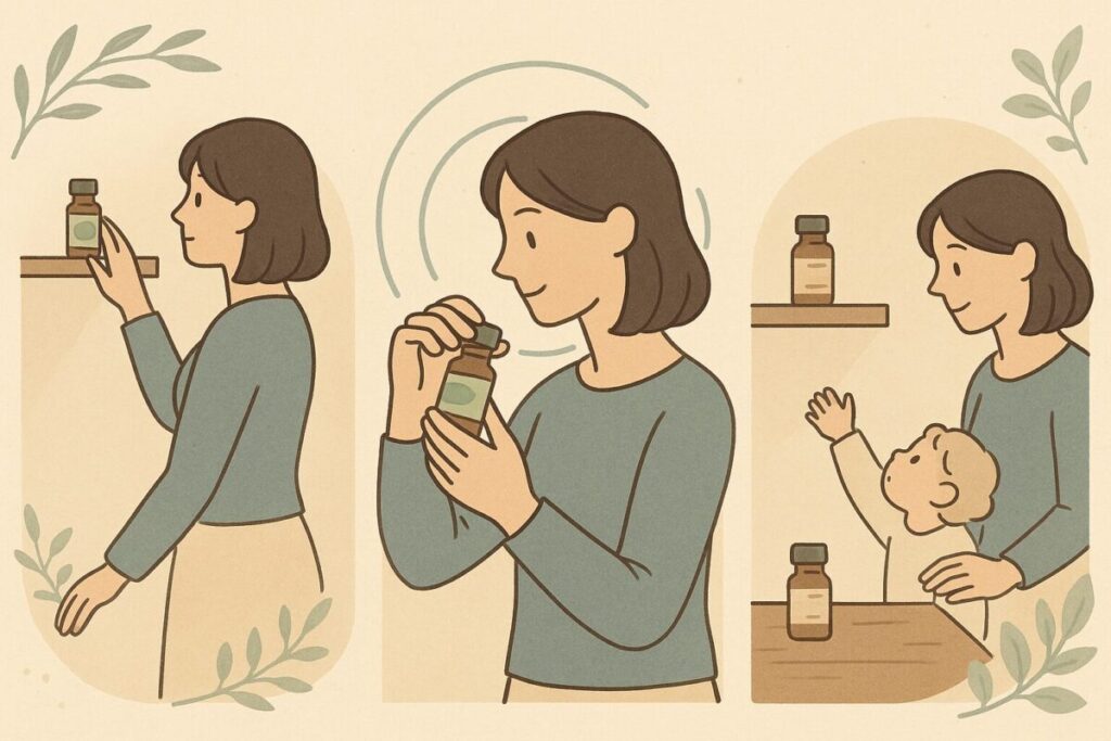 - 購入時の遮光瓶のまま保存: 無印良品の精油は、光を遮断する濃い色の遮光瓶に入っています。絶対に別の容器に移し替えたりせず、この瓶のまま保管してください。